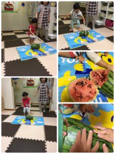 今週は、スイカ割りを室内でしました。