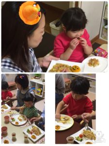 楽しく会食して、食欲増進がはかれました。でも、びっくりして泣いてしまったDくんでした。Rちゃんは、「ハロウィン大好き」と言っていました。kちゃん、Oくんは、いつもより食べるスピードも早かったです。Hくんは、いつもと違うお皿でしたが、上手に食べていました。