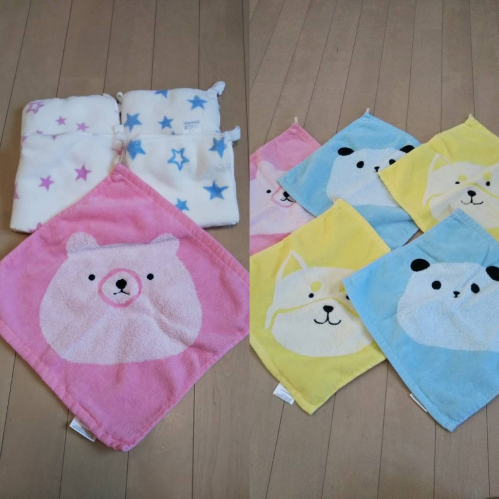 ループタオル、食事用エプロン、おしぼりを用意しています。