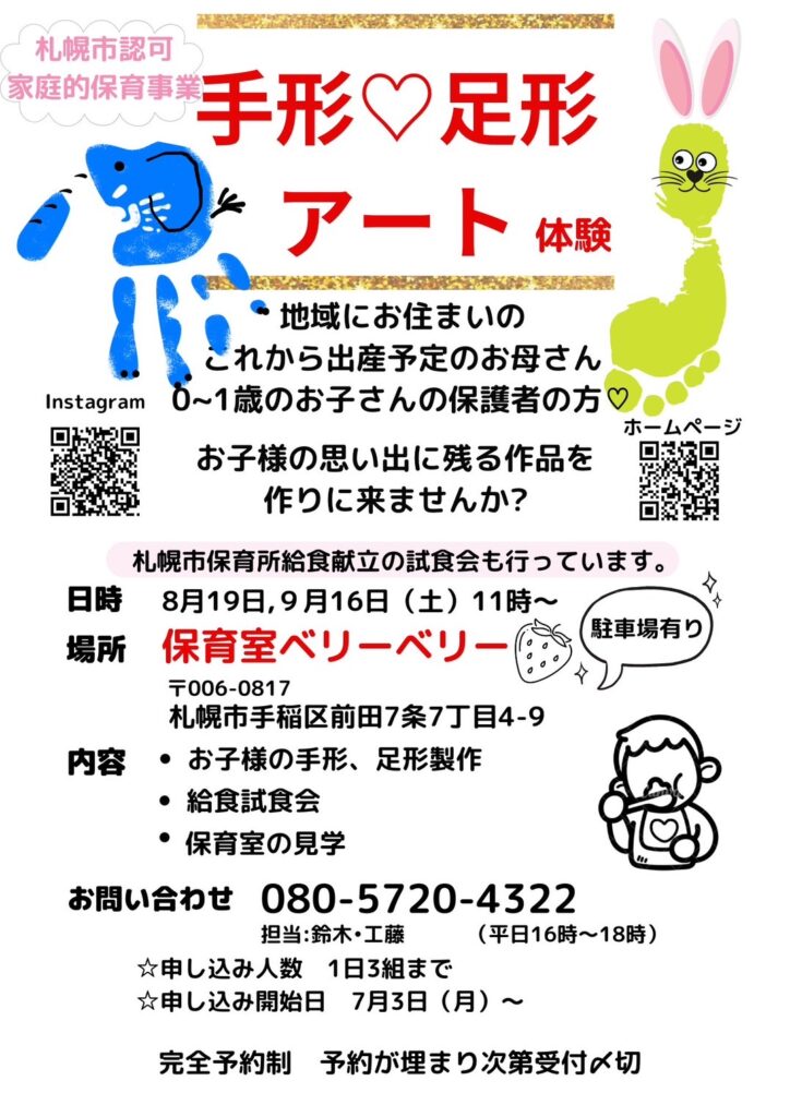 親子で手形アートを作って→保育室で大人気の給食も試食しましょう!!