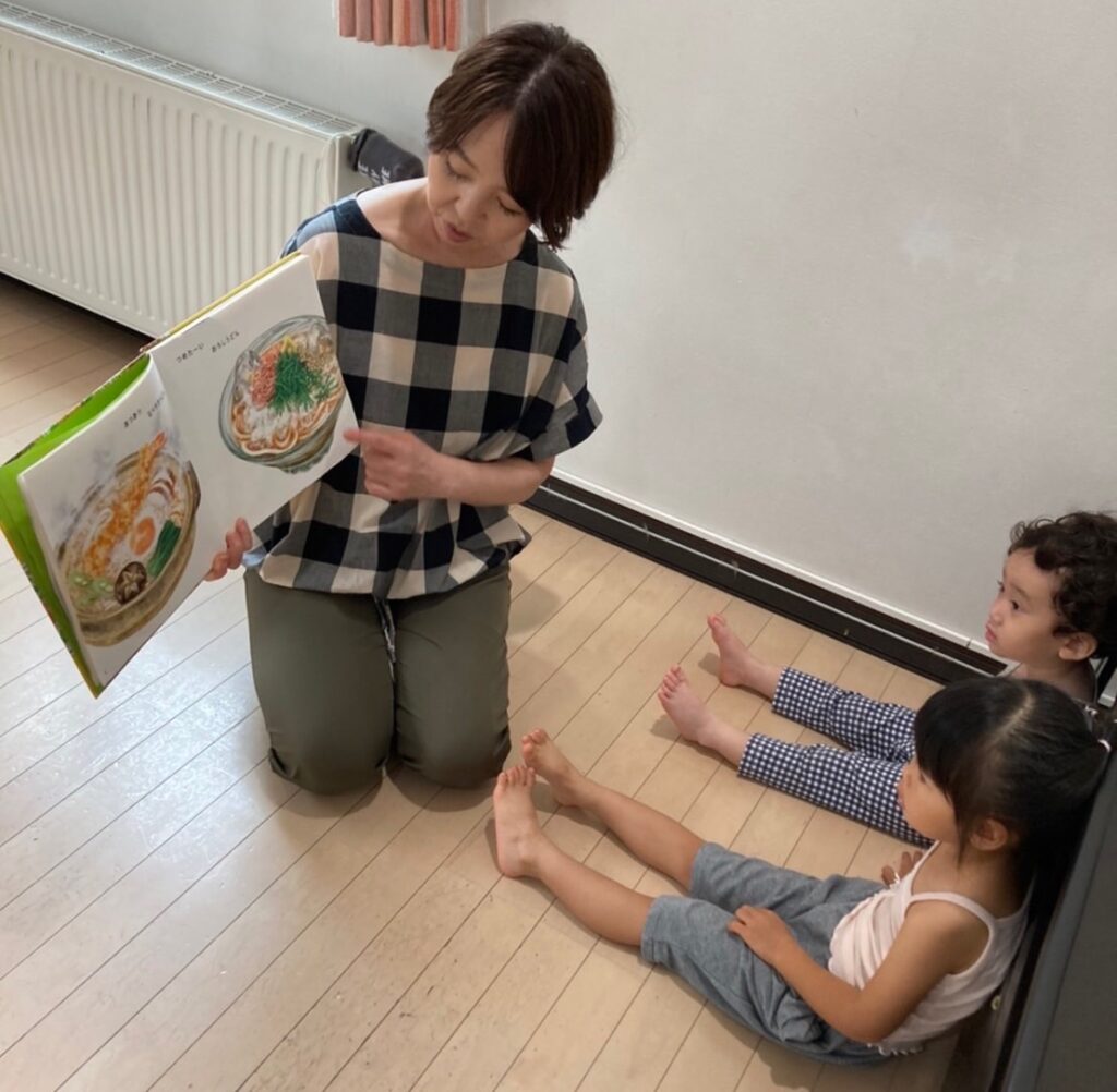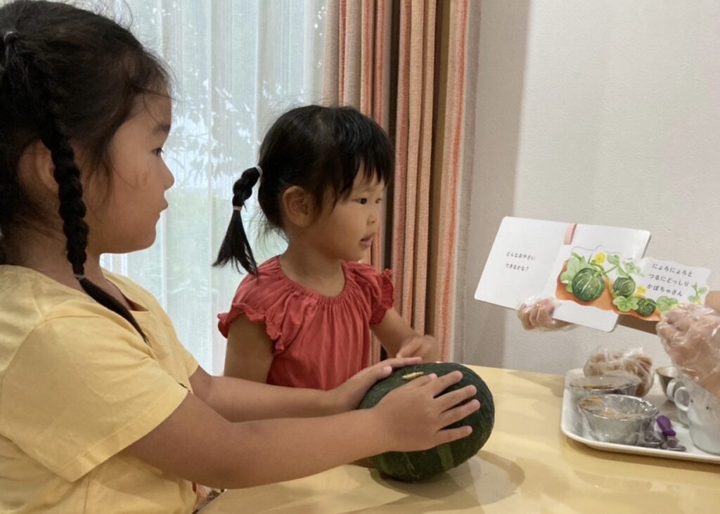 パンやジャム、カボチャが出てくる絵本の読み聞かせを行い