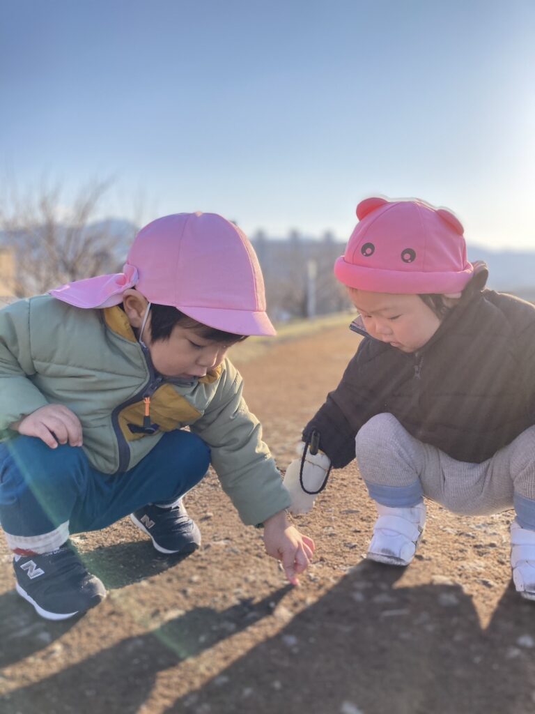 春の風にふかれながら走ったり立ち止まったり花や小さな虫を観察したりと、戸外活動を通して季節を感じています。