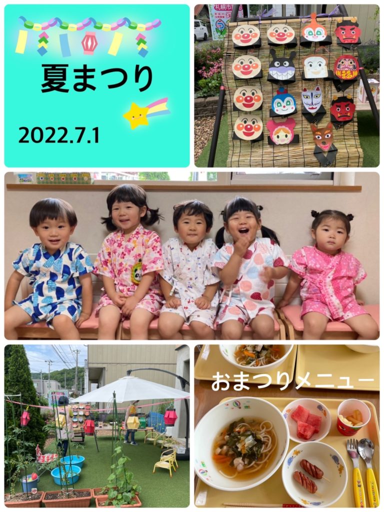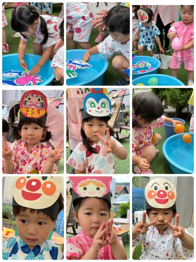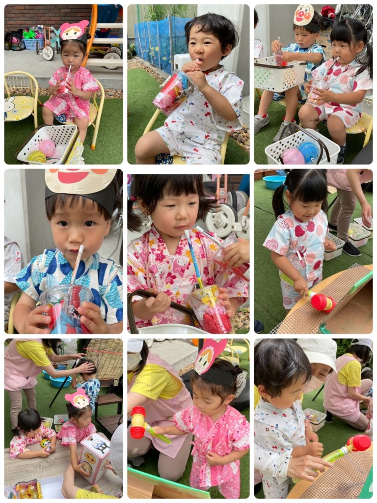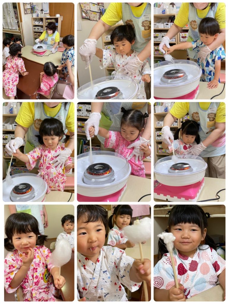 アンパンマン音頭、魚すくい、ヨーヨー取り、お面選び、ガチャガチャ、ワニワニゲームをしてから室内で綿あめ作り、水分補給のジュースの飲んで、給食のおまつりメニュー!