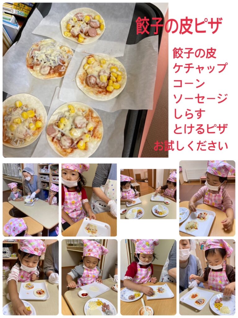 今回は、餃子の皮でピザを作りホットプレートで焼いて食べました。具材を自由にトッピングしたのですが、さすが2歳児さんばかりですからみんな上手です!
